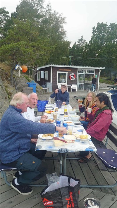 På söndagsmorgonen äter vi frukost och några dukar upp på bryggan, vilka dagar vi fick här ute. Vid lunch var det så dags att segla hem igen. Vid 18 lägger vi till i Skärvassa och här är det helt lugnt. På måndagsmorgonen när vi vaknar ser vi endast 100 meter och vi ligger kvar någon timma innan vi lägger ut och då ser vi 200 meter på sin höjd. Vi glider fram I sakta mak och efter ytterligare någon timma lättare det något igen. Vi hade tänkt att kunna ta oss till Järflotta men får lägga oss i Rånö hamn igen då vinden dött ut helt igen. På tisdagsmorgonen är det samma tjocka dimma men den lättare något och kan gå bidevind över Mysingen ner till Viksten för att sen lägga till på kvällen i Trosa. Det blev många härliga seglingsdagar.