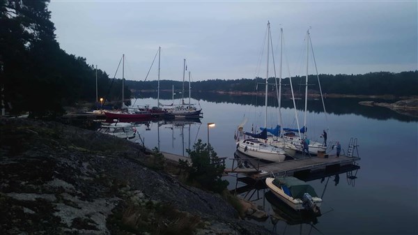 Den 4 september kl 20 la vi ut från Trosa för segla upp till träffen på Västerö. Så här års så kommer kvällen tidigt men ikväll fick vi fullmåne och det var även en blodmåne vilket gjorde att vi fick en fin nattsegling i mycket lätta vindar. Vi hade tänkt att lägga oss vid SXK-bojarna vid Herrhamraleden men det rullade in för mycket sjö där så vi fick fortsättsätta. Klockan var nu 00 och kosan ställdes till Rånö hamn istället dit vi kom kl 04 på morgonen. 30 M på 8 timmar, ingen raketfart direkt men en fantastisk natt som faktiskt var varm. När vi kastar ankar ser vi att Roland ligger på svaj strax intill, vilket sammanträffande. Strax före 10 är vi iväg igen och nu kan vi hissa spinnaker över Mysingen vilket gör att vi får lite bättre fart i den mycket lätta brisen. Vid tretiden har vi lyckats komma fram till Ornö Strömmar och det glider på lite bättre nu, men när vi kommer ut på Jungfrufjärden avtar vinden ytterligare så vi når vårt mål Norrviken först kl 20 och kan lägga oss på svaj längst in i viken. Alla bojar är tagna och bryggan är smockfull av SXK-are Qvinna ombord/24 timmars. Dom tycks ha hur kul som helst och vi äter lite gott och somnar tidigt. Äter en god frukost i vanlig ordning och lägger ut vid 10, nu är det dimma så vi kryssar och håller oss tätt intill västlandet utanför Stavsnäs. På Kanholmsfjärden lättare dimman och vi kan hålla kurs mot Fjärdholmen. När vi kommer dit möter Stefan med Friendship upp oss och vi seglar gemensamt in i den fina lilla arkipilagen ost om Granholmen. Det blir en magisk segling bland kobbar och skär där vi glider fram i lätt vind och aftonsol. När vi väl kommer fram är kl 18 och vi möts av alla kompisar som seglat ut hit och som väntat på att vi äntligen har kommit fram. Alla brassar sin medhavda mat och vi dukar upp ett långbord på bryggan och njuter av kvällen. Det finns ett brygghus dit vi kryper in efter maten och fortsätter festen till sena kvällen.